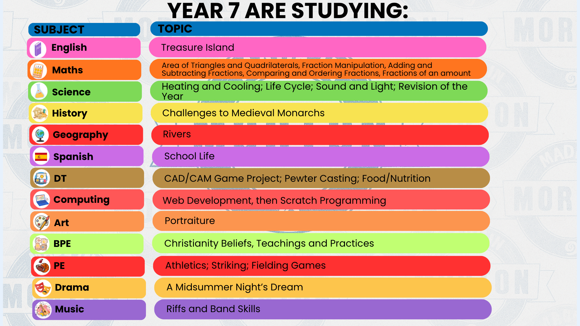 History, Geography, Spanish, Computer Science, Media, Childcare, Art, Food Technology, Music, Performing Arts, Engineering, NCFE PE, GCSE PE, Animal Care
