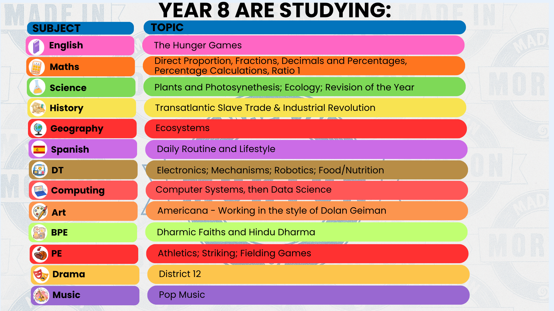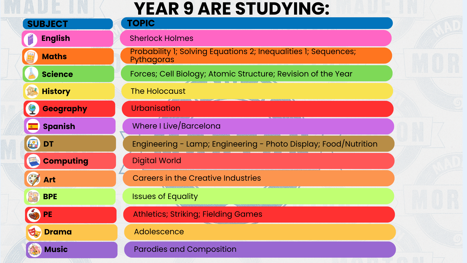 History, Geography, Spanish, Computer Science, Media, Art, Food Technology, Music, Performing Arts, Engineering, GCSE PE, Animal Care, Health and Social Care, RE.